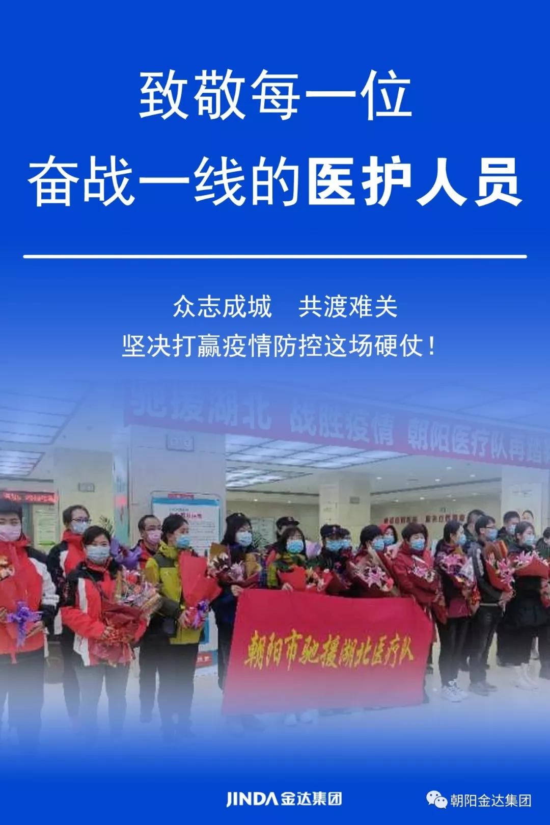 为表达对医护人员的崇高敬意和诚挚慰问,金达集团向朝阳市驰援武汉医疗队捐赠100万元人民币...